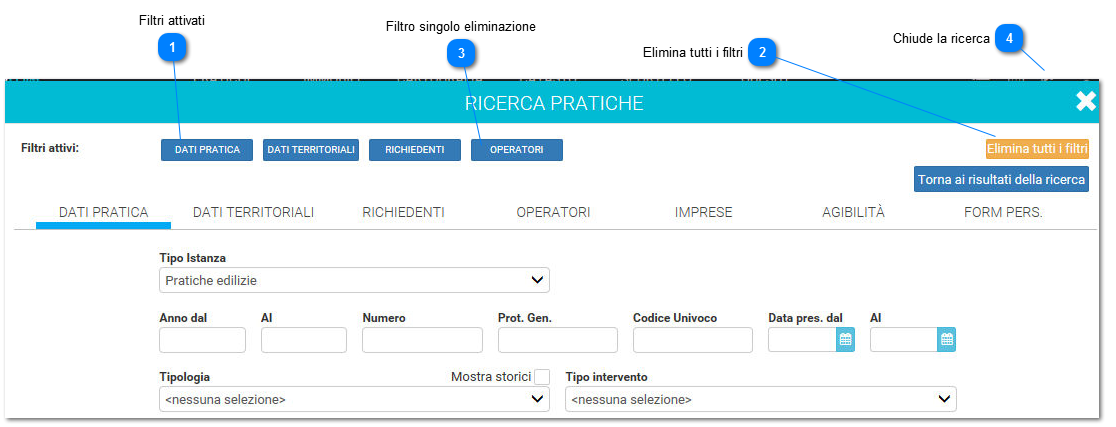 Per chiudere la ricerca cliccare la X in alto a destra del form. La ricerca comunque rimane impostata e riaprendo il form della ricerca si può consultarne i risultati o modificarla.
