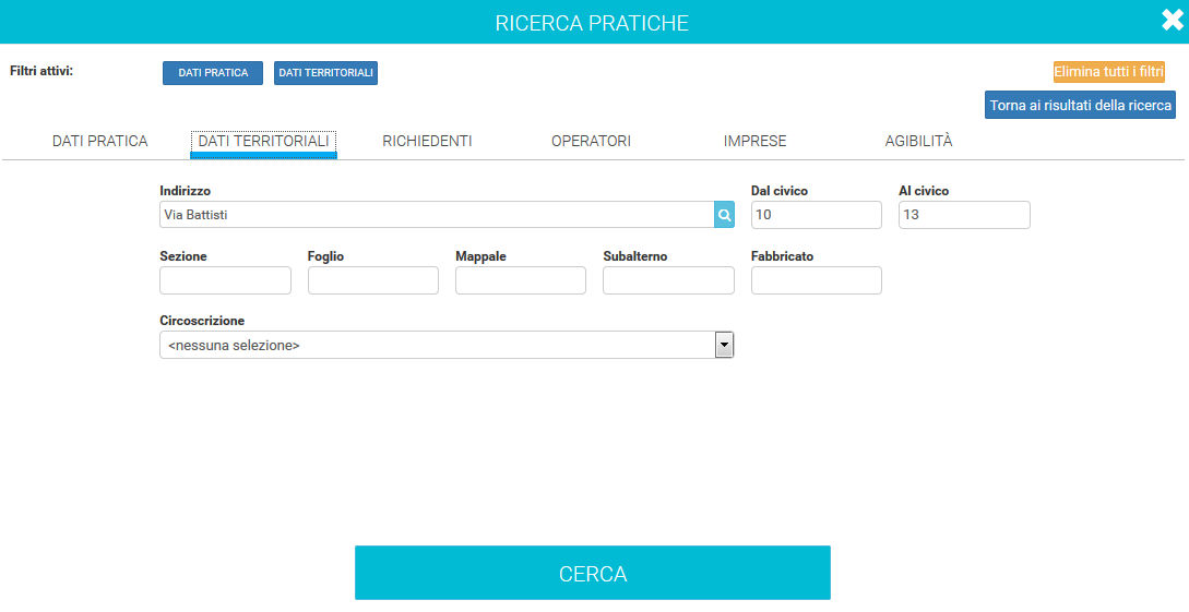 Con questa funzione si apre la sezione della ricerca pratiche. Fare riferimento per tutti i parametri di ricerca alla sezione Ricerca delle pratiche .