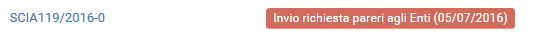 Anche in questa sezione vengono mostrati tramite il colore lo stato dei tempi. In questa sezione però non viene utilizzato il verde, perchè vengono visualizzati in giallo i processi vicino alla scadenza e in rosso i processi il cui termine è già scaduto. Nell'esempio sopra esposto viene indicata che la pratica è sulla scrivania del responsabile Brambilla che doveva accettarla ma non lo ha ancora fatto e che l'utente arebbe dovuto procedere alla richiesta di integrazione entro l'11/06/2016 ma non lo può fare in quanto la pratica non è ancora stata accettata dal responsabile.