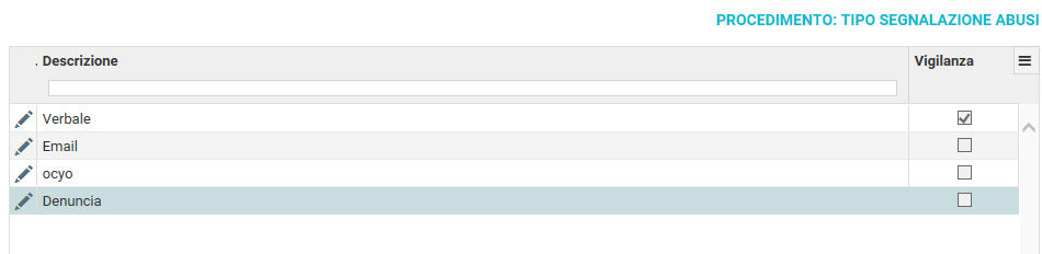 In Tipo segnalazione Abusi vengono inserite le descrizioni delle possibili segnalazione di abusi.